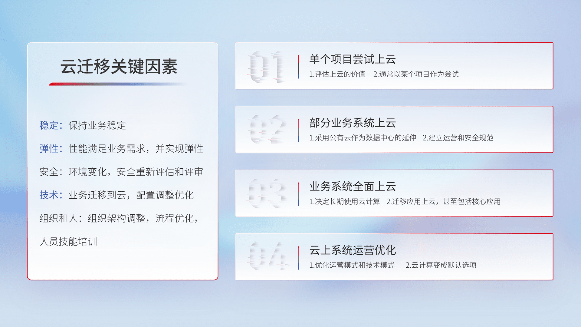 结合实际业务,,,,从规划设计、、云平台选型、、云原生改造、、、数据迁移、、、集成交付,,,,迁移全过程为客户识别最佳上云路径,,做好风险识别管理,,,设计网络架构、、、、身份权限、、、、安全审计合规、、、、操作审计、、、日志审计、、、监控告警策略、、、多站点容灾设计等,,对云上基础设施进行整体规划,,提升IT治理水平,,以满足弹性、、高可用、、、、高性能的需求。。。。